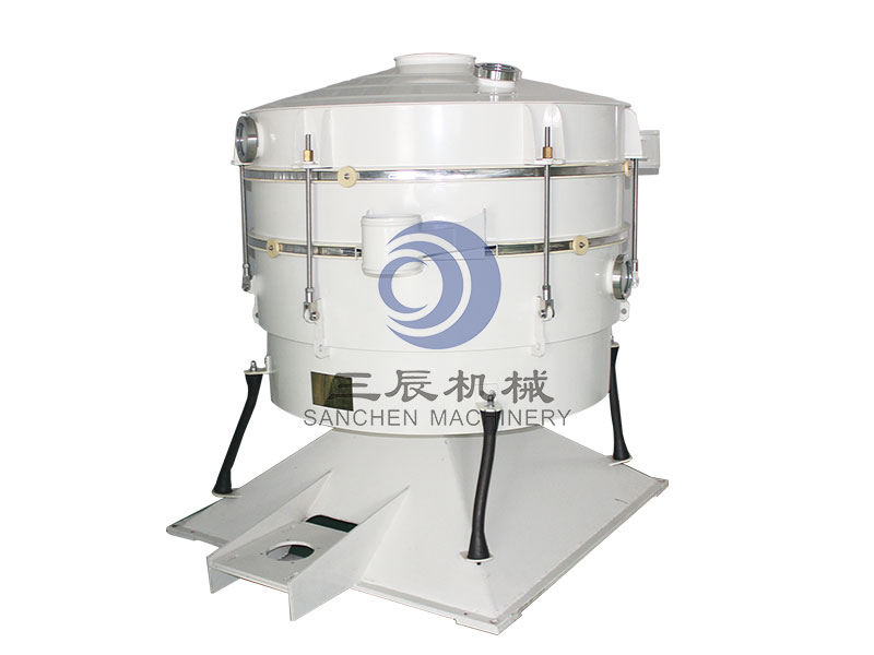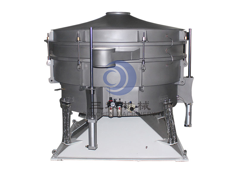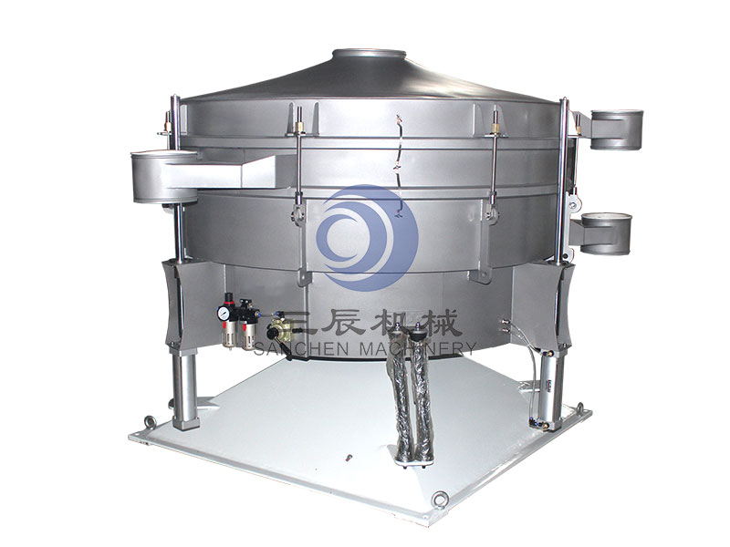 從運行軌跡來看,搖擺篩是一種非線性慣性振動篩,基本的回轉運轉與人工篩分相類似。偏心率從25到40mm可調,低速V型皮帶驅動從120到360rpm可調。每一種產品的停留時間可以通過搖擺篩的徑向與切角朝驅動軸線方向進行調整。因此建立水平與拋擲三維翻滾運動。物料從中心到外緣在整個篩面上均勻分散,從而以螺旋運動往軸向傳播。細小顆粒從而完成了整個篩分過程。水平與垂直加速度隨著粒子的運動而增加,接近篩孔尺寸的顆粒隨之成功分離;較大顆粒被運到出口處,出口處有一個可調節的導向裝置控制流量,該導向裝置是控制物料停留時間的另一個因素。